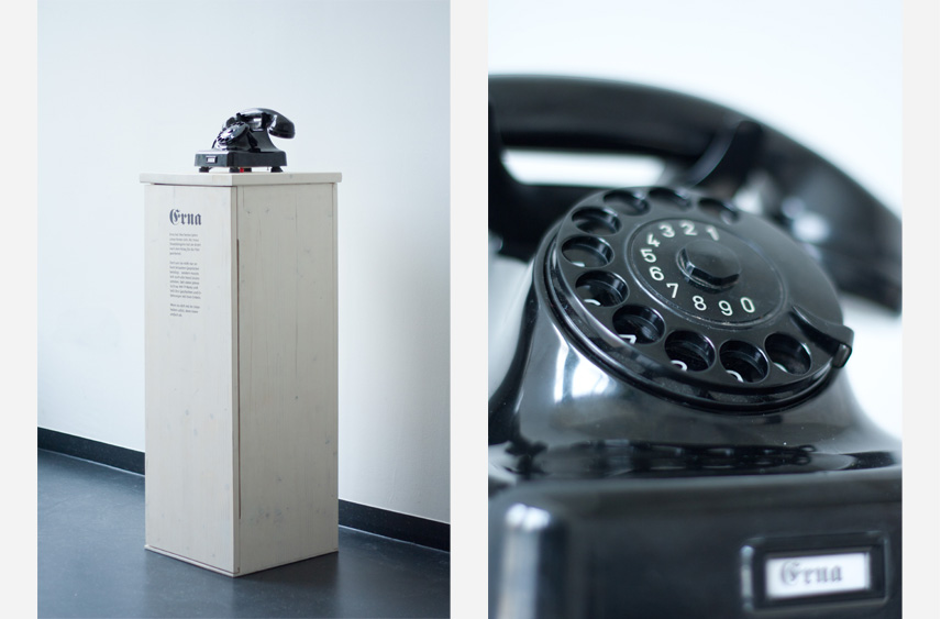 In diesem Projekt war es mein Ziel, ein altes Gerät mit neuer Technik zu erweitern. Dafür wählte ich ein 65 Jahre altes Telefon. Hierbei war mir wichtig das Telefon in seinem Ursprungszustand zu belassen. Für das Abgreifen der analogen Daten des Telefons nutzte ich Arduino, die Software dazu habe ich in Processing programmiert. Wenn der Nutzer den Hörer abnimmt begrüßt ihn eine generative Frauenstimme und führt ihn in das Hauptmenü, wo ihm 5 Anwendungen zu Verfügung stehen. Erna kann dem Nutzer sagen, was in jedem Jahr zwischen 1 und 2001 passiert ist. Sie kann das Wetter für jeden Ort in Deutschland vorhersagen und erzählt unnützes Wissen. In anderen Menüpunkten, lässt das Telefon den Besucher selbst eine Geschichte erzählen, oder stellt eine Umfrage zum Thema soziale Medien.