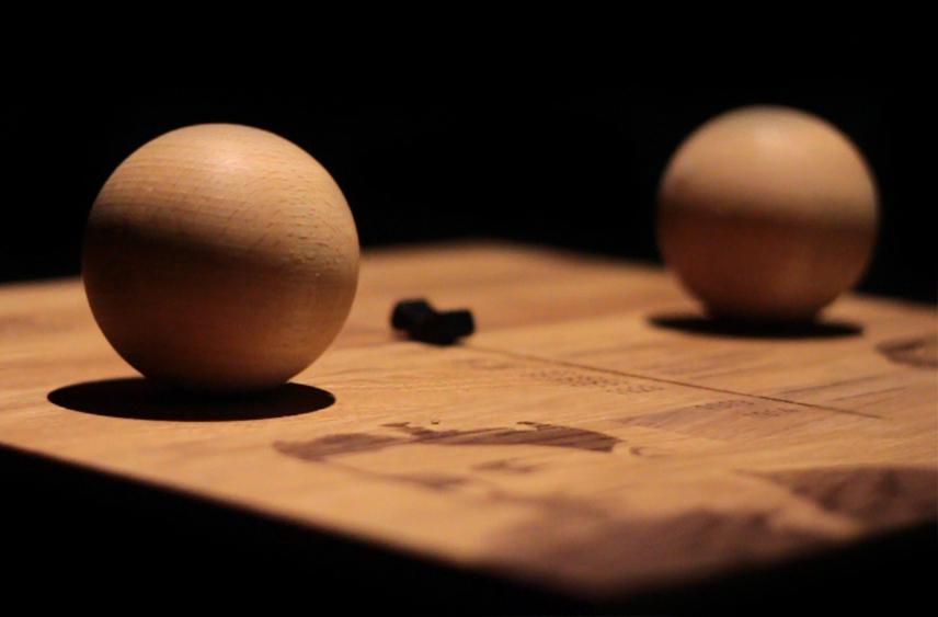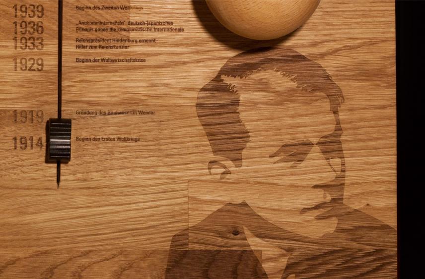 Dafür habe ich beispielhaft zwei Personen ausgewählt. Auf der rechten Seite der Stele ist Hitlers Architekt Albert Speer abgebildet. Auf der linken Seite Franz Ehrlich, ein Kommunist und Bauhaus-Architekt. Beide haben zur Zeit des Dritten Reiches gelebt. Die Installation funktioniert folgendermaßen: man wählt mit dem Schieberegler ein Jahr zwischen 1910 und 1980 aus. Dann kann man das Leben der beiden Personen an den ihnen zugeordneten Kugeln hochheben. Das Gewicht der Kugeln ändert sich von Jahr zu Jahr, und spiegelt jeweils wider, wie schwer die Zeit für die ausgewählte Person war. Hebt man beide gleichzeitig hoch, so kann man die Schwere der beiden Leben vergleichen. Hebt man nur eine Kugel an, so erzählt dieses Leben, was der Person im ausgewählten Jahr passiert ist.